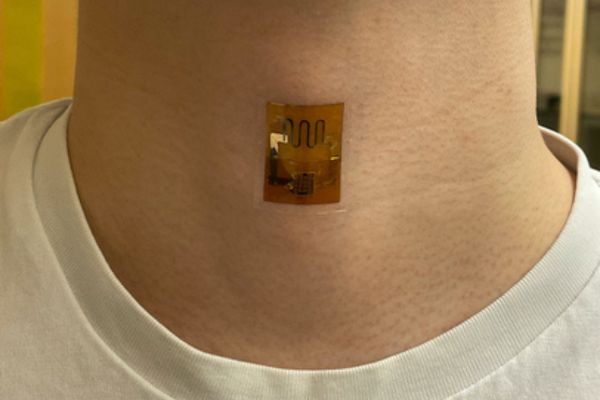 Photo credit: A biofilm-powered sensor, on the neck, that measures the mechanical signal of swallowing.